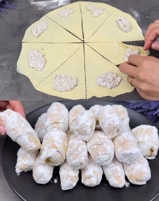 Împărțiți aluatul în 4 părți, întindeți fiecare parte într-o foaie și tăiați triunghiuri. Umpleți-le și rulați-le ca pe sarmale. Coaceți-le în cuptorul preîncălzit la 180°C (350°F) timp de 25 de minute. Presărați-le bine cu zahăr pudră.