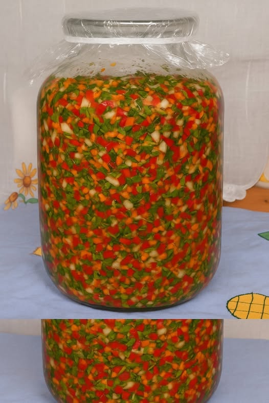 Tăiați toate legumele, presărați-le cu sare și puneți-le în borcane de trei litri. Închideți borcanele cu capace și păstrați-le în frigider. Iarna, adăugați-le în borșuri, supe și sosuri.