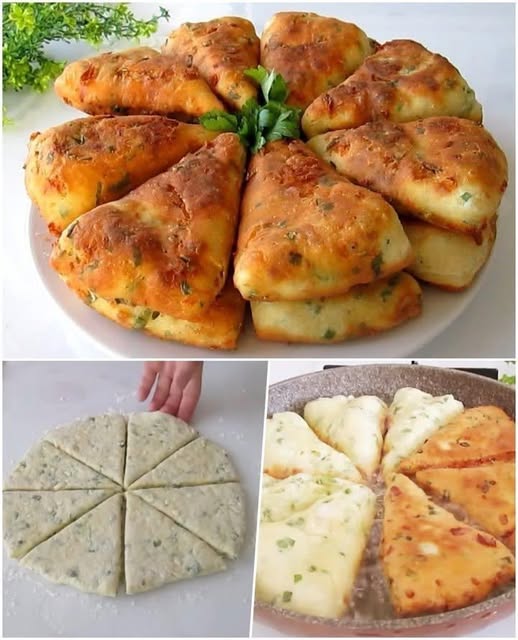 Într-un bol mare, combină ouăle cu laptele, sarea, brânzeturile rase și verdeața tocată. Adaugă praful de copt, apoi încorporează făina, frământând bine până obții un aluat elastic și ușor lipicios. Împarte aluatul în două părți egale, întinde fiecare parte în foi nu foarte subțiri și taie-le în 8 bucăți. Prăjește bucățile în ulei bine încins până capătă o culoare aurie și o crustă crocantă. Poftă bună!